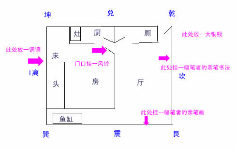 4)、在巽方入放置一幅笔者亲自画的画及在坎方挂上一幅笔者亲自写的书法,用以消除室内的衰气,增强室内的吉气,使以前的衰宅变成催财旺丁之吉宅。此亦为主人转运关键之四也。