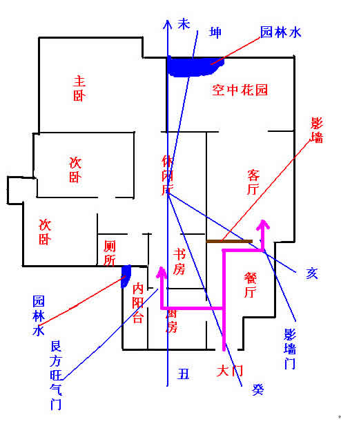 2)、男主人命卦为离,女主人为坤卦,命卦配合室内环境:大门开坎卦,纳衰气,艮宅开坎门,为廉贞门,失运失方,门大凶!好在门开男主人的延年位置,一时不会发凶。运过即凶。厨房在艮卦,大吉利,灶非常得运,灶坐卯向酉,坐向与大门相生,吉利。尽管压在女主人的生气方,也问题不大;厕所在震方,厕所属水,零神归位,得运吉利。但厕所压住了男主人的生气方,吉中有凶,利弊同见,利大于弊。主卧在离方,正神在山,在男主人的伏位,吉利。床头坐巽,木火相生,大吉利。兑方阳台,玄关通,吉利的纳气口。但乾方为墙,无窗,玄关不通,不吉。