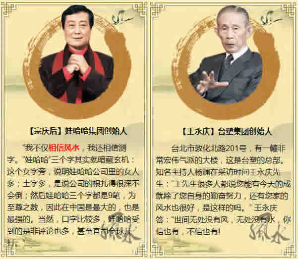 娃哈哈集团董事长宗庆后曾经这样表达自己对风水的笃信:我不仅相信风水我还相信预测字;“娃哈哈”三个字其实就是暗藏玄机,这个女字旁,说明娃哈哈公司里女士多;土字多,是说明公司的根扎得很深不会倒;然后“娃哈哈”三个字都是九画,为九五至尊之数,因此在中国最大的也是最强的;当然“口”字多,娃哈哈受到的是非评论也多,甚至娃哈哈和达能公司决裂,官司全球开打!