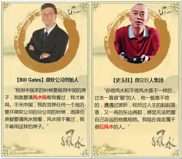 《中国富豪风水调查》报告:结果让人吃惊:98%的富豪相信做生意是要讲究风水的!其中做生意前就相信风水的占48%;做生意后方觉得风水必须相信的占50%。另外,企业与富豪本人有专业风水顾问的占77%,每年要请风水顾问的则高达96%。您可能没有注意到,从内地到香港,从上海滩到华尔街,几乎每个大企业家的背后,都站着一个神秘莫测的风水大师……