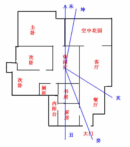 2)、男主人命卦为离,女主人为坤卦,命卦配合室内环境:大门开坎卦,纳衰气,艮宅开坎门,为廉贞门,失运失方,门大凶!好在门开男主人的延年位置,一时不会发凶。运过即凶。厨房在艮卦,大吉利,灶非常得运,灶坐卯向酉,坐向与大门相生,吉利。尽管压在女主人的生气方,也问题不大;厕所在震方,厕所属水,零神归位,得运吉利。但厕所压住了男主人的生气方,吉中有凶,利弊同见,利大于弊。主卧在离方,正神在山,在男主人的伏位,吉利。床头坐巽,木火相生,大吉利。兑方阳台,玄关通,吉利的纳气口。但乾方为墙,无窗,玄关不通,不吉。