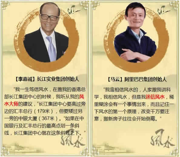 亚洲首富李嘉诚一生笃信风水,在盖香港长江集团总部的时侯,充分听信了风水师“长江集团中心要高过旁边汇丰银行179米,但要矮过另一旁的中银大厦367米”的建议。中国网络之父马云,聘请风水大师为七个公司选址策划。